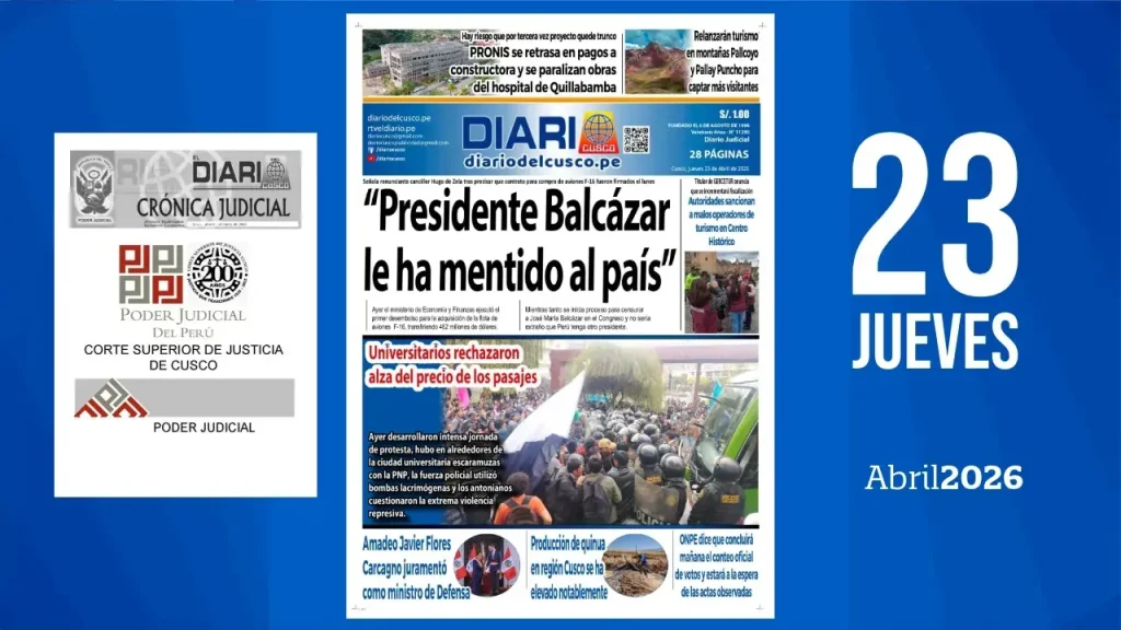 PRONIS se retrasa en pagos a constructora y se paralizan obras del hospital de QuillabambaHay riesgo de que por tercera vez el proyecto quede trunco. Relanzarán turismo en montañas Pallcoyo y Pallay Puncho para captar más visitantes “Presidente Balcázar le ha mentido al país”Señala el renunciante canciller Hugo de Zela tras precisar que el contrato […]