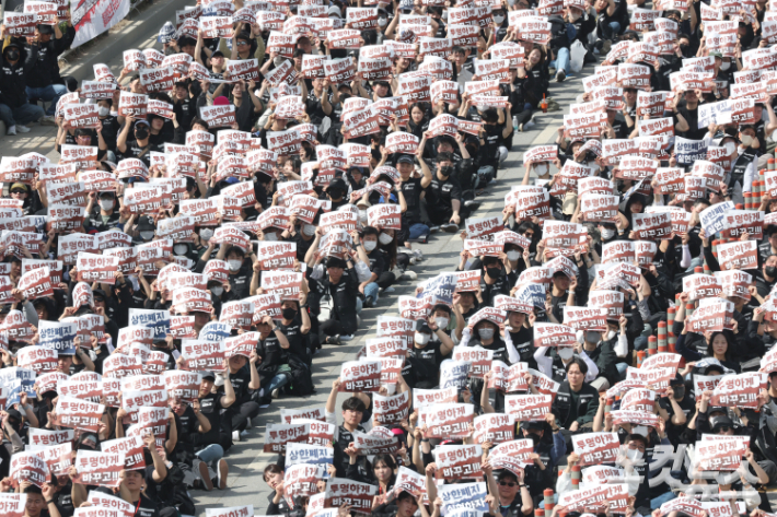 삼성전자 과반노조인 ‘삼성전자 초기업노조’ 조합원들이 23일 경기 평택시 삼성전자 평택캠퍼스 앞에서 ‘투명하게 바꾸고, 상한폐지 실현하자-4.23 투쟁 결의대회’에서 구호를 외치고 있다. 이날 결의대회에는 경찰 추산 3만여 명, 노조 추산 3만 9천여 명이 참여했다. 노조는 회사의 영업이익 15% 성과급 지급, 성과급 상한제 폐지 등을 요구했으며, 사측과 합의가 이뤄지지 않을 경우 다음 달 21일부터 6월 7일까지 총파업에 돌입한다고 […]