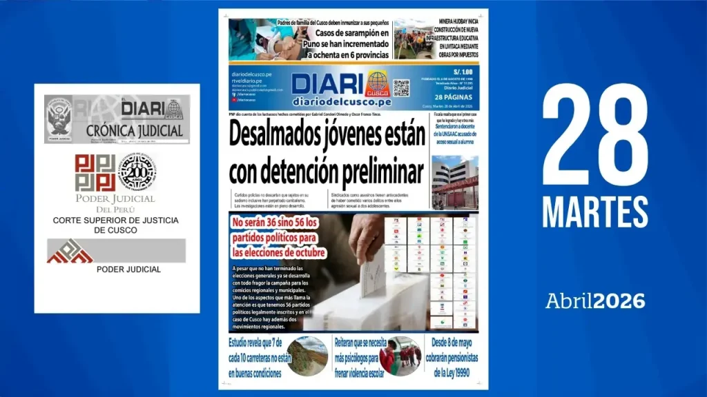 Padres de familia del Cusco deben inmunizar a sus pequeñosCasos de sarampión en Puno se han incrementado a ochenta en 6 provincias. Desalmados jóvenes están con detención preliminarPNP dio cuenta de los luctuosos hechos cometidos por Gabriel Condori Olmedo y Óscar Franco Tinco. Curtidos policías no descartan que los sujetos, en su sadismo, inclusive hayan […]
