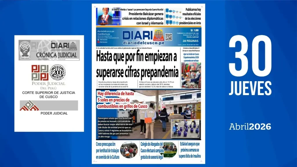 Presidente Balcázar genera crisis en relaciones diplomáticas con Israel y AlemaniaAl haberse referido a “causas” que provocaron la Segunda Guerra Mundial. Publicamos hoy resultados oficiales de las elecciones presidenciales en Anta Hasta que por fin empiezan a superarse cifras prepandemiaEn la actividad turística del Cusco, señala el gobernador regional Werner Salcedo Álvarez. Durante los primeros […]