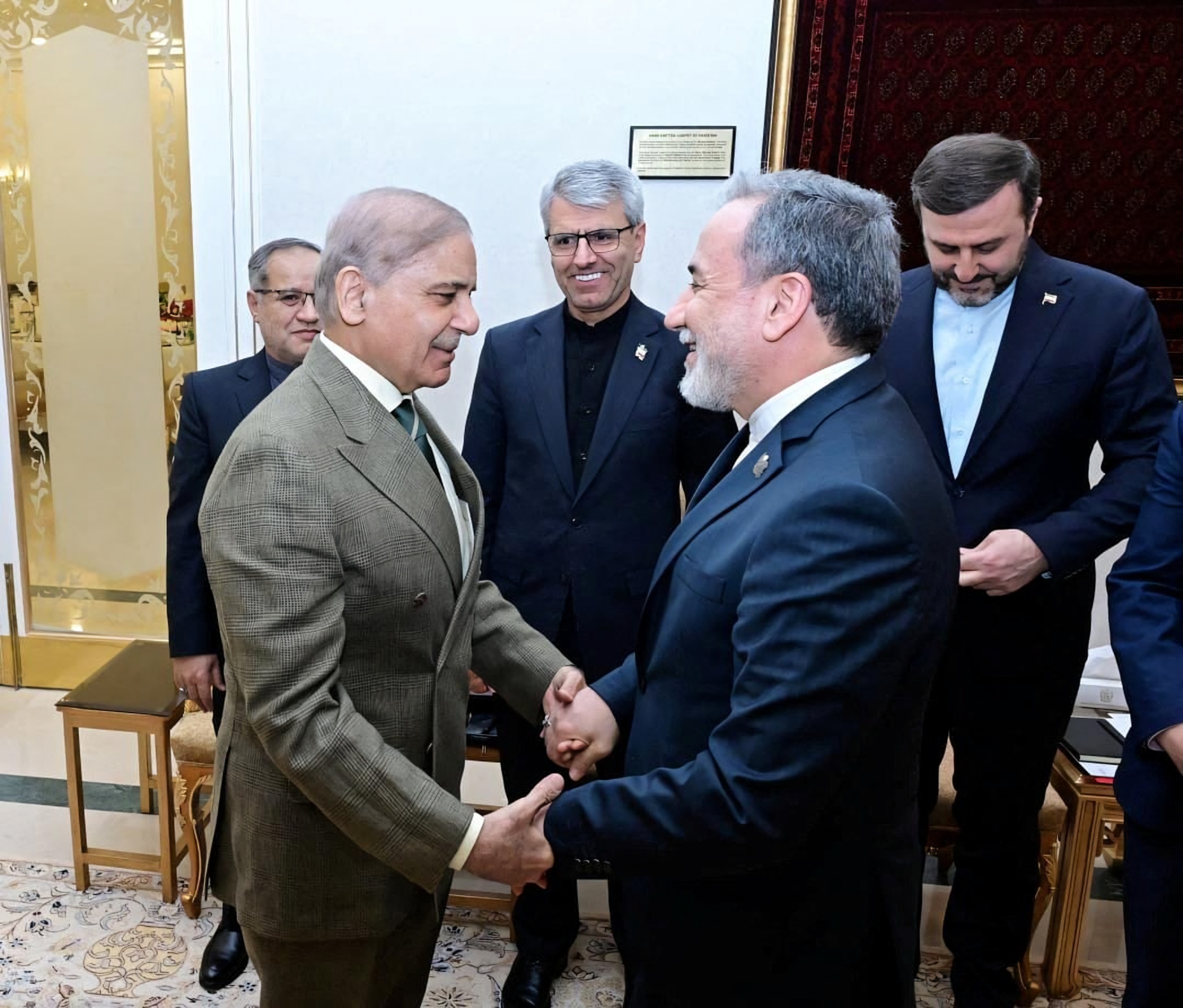 Pakistan’s Prime Minister Shehbaz Sharif meets with Iranian Foreign Minister Abbas Araqchi in Islamabad, Pakistan, Saturday. Pakistan’s Prime Minister Office/Handout via Reuters-Yonhap