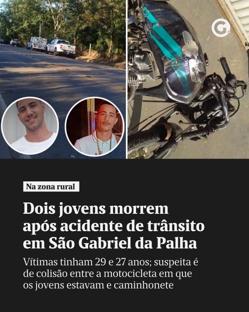 🚨 Dois jovens morreram após um acidente de trânsito na zona rural de São Gabriel da Palha, no Noroeste do Espírito Santo, na madrugada deste domingo (26). A repórter da TV Gazeta Norte, Luciany Oliveira, esteve na Seção Regional de Medicina Legal (SML), em Colatina, para onde os corpos foram levados, e confirmou que as vítimas são Jean Costa de Oliveira, 29 anos e Weliton Silva Frederico, 27 anos.