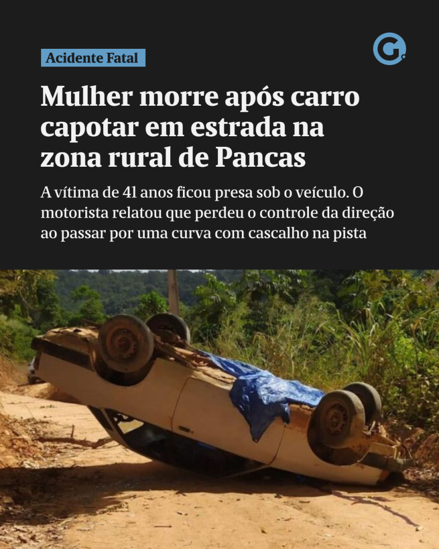 😢 Uma mulher de 41 anos morreu após um carro capotar na manhã desta segunda-feira (27), na localidade de Córrego São José Pequeno, zona rural de Pancas. De acordo com a Polícia Militar, a vítima ficou presa sob a porta do veículo e já estava sem vida quando a equipe chegou ao local. Moradores relataram ter ouvido um forte barulho e, em seguida, viram o motorista, de 45 anos, pedindo socorro para a esposa.⠀