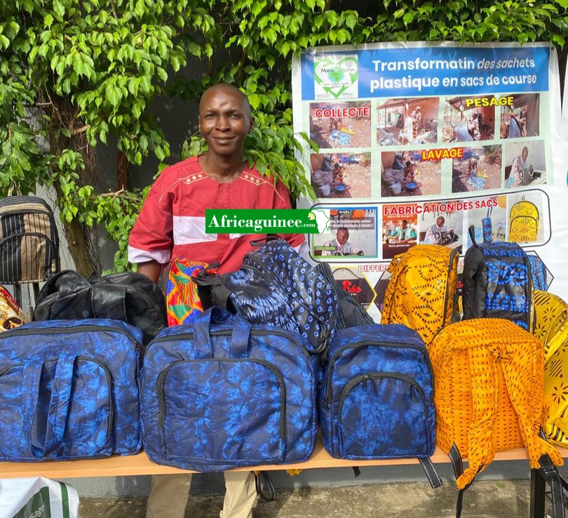 Installé à Sanoyah, à une trentaine de kilomètres de Conakry, Fodé Camara a fondé Managnouma SARL, une petite unité spécialisée dans la transformation de sachets plastiques en sacs réutilisables.Dans son modeste atelier, équipé d’une machine à coudre et de quelques outils de base, il donne une seconde vie aux déchets plastiques. Suspendus à l’entrée, ses sacs colorés attirent l’attention des passants.