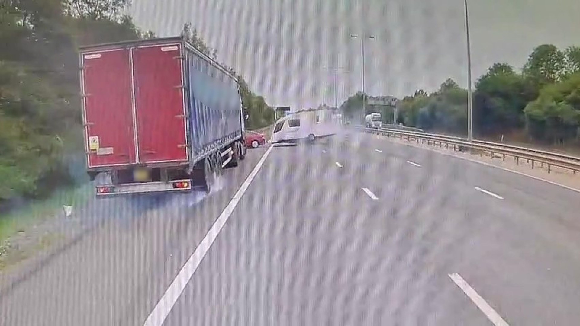 Fortunately, the lorry driver had slammed on the breaks and pulled the 15.5 tonne vehicle onto the hard shoulder as the caravan was swerving down the road.