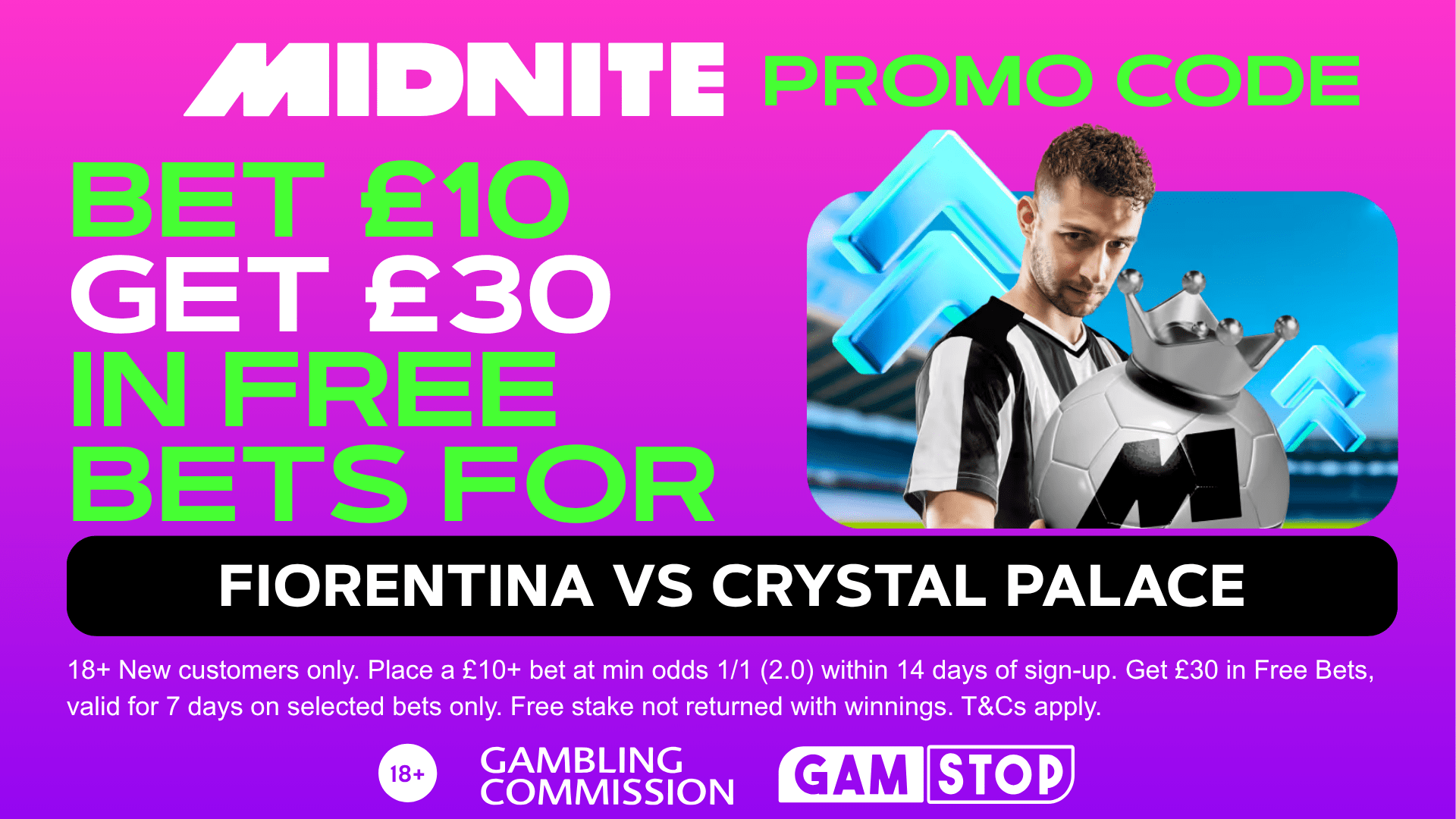 - Place a £10 bet on Fiorentina vs Crystal Palace (or any market) at odds of Evens (2.0) or greater.
